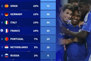 體育資訊2月27日訊 本賽季歐冠淘汰賽抽簽在即,德轉(zhuǎn)也盤點(diǎn)了自03/04賽季賽制改革之后,各聯(lián)賽球隊(duì)晉級(jí)16強(qiáng)次數(shù)占比,具體如下(占比+次數(shù)):