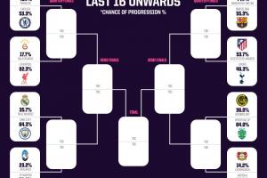 體育資訊02月27日訊 OPTA超算對歐冠1/8決賽進行了10000次模擬,各組對陣晉級概率如下。