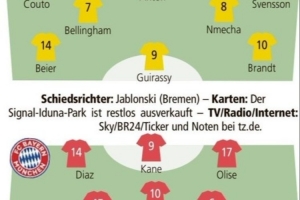 體育資訊2月28日訊 本輪德甲焦點(diǎn)戰(zhàn),多特蒙德將在伊杜納信號公園球場迎戰(zhàn)拜仁慕尼黑。《踢球者》也預(yù)測了雙方首發(fā)陣容。