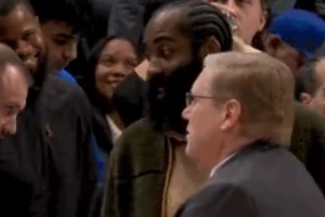 GIF-活塞主場音響設(shè)備出問題 哈登場邊熱聊