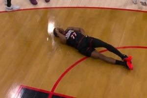 上半場最后一攻,埃奇庫姆反擊追身三分出手,被身后追防的卡特·布萊恩特撞到失去平衡摔倒,背部著地受傷離場,76人官方隨后宣布埃奇庫姆背傷不會(huì)回歸。