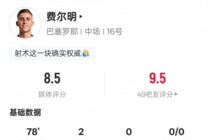 體育資訊1月22日訊 歐冠聯(lián)賽階段第7輪,巴薩客戰(zhàn)布拉格斯拉維亞,費爾明首發(fā)出戰(zhàn),貢獻雙響,還有1次關(guān)鍵傳球,4次搶斷,評分8.5。