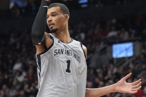 賽后,斯圖爾特接受了記者采訪。談到文班亞馬,他說道:“他是個高個子,占了很大的空間。我們必須更好地調(diào)動他,直接沖擊他的胸部(playing straight through his chest)。這對我們有幫助,也是他的弱點所在,當防守者沖向他的胸部時(when he’s got defenders going at his chest),他會掙扎。”