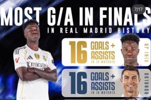 體育資訊01月23日訊 維尼修斯更新社媒,曬出自己在皇馬隊(duì)史決賽進(jìn)球+助攻數(shù)的排名,他本人以16個(gè)進(jìn)球+助攻與C羅、本澤馬和普斯卡什并列榜首!