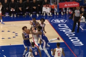 是個(gè)好防守!申京籃下強(qiáng)打恩比德造犯規(guī) 76人挑戰(zhàn)成功