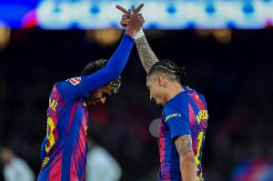 本賽季4位上演帽子戲法的巴薩球員是萊萬多夫斯基、費蘭·托雷斯、亞馬爾和拉菲尼亞。
