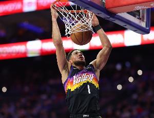 布克第三節(jié)手感火熱,單節(jié)8中6砍下16分,本場(chǎng)已經(jīng)19中13得到35分3籃板5助攻。