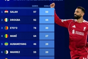 體育資訊3月19日訊 在歐冠淘汰賽次回合,利物浦4-0大勝加拉塔薩雷,薩拉赫破門,打進(jìn)個(gè)人生涯歐冠第50球,以下為非洲球員在歐冠改制后射手榜: