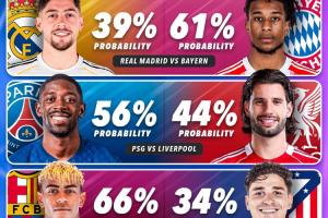 體育資訊03月19日訊 歐冠八強已經(jīng)全部產(chǎn)生,外媒Score90根據(jù)相關機構賠率,列出了各隊晉級四強的概率。在1/4決賽中四組對陣中,拜仁、巴黎、巴薩、阿森納擁有更高的晉級概率。