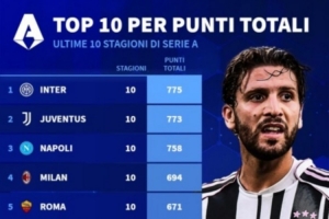 體育資訊3月21日訊 德國轉(zhuǎn)會市場統(tǒng)計了過去10個賽季各隊在意甲的總積分,并列出榜單,國米775分居首,尤文773分次席。