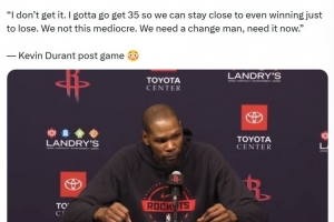 賽后,美媒Hoop Quotes曬出了杜蘭特的賽后采訪,他說道:“我不明白。我必須拿到35分才能勉強保持比賽的懸念,結(jié)果還是輸球。我們不應(yīng)該這么平庸。我們需要改變,現(xiàn)在就需要。哦不,我得去做我的工作了。無論輸贏,我還是能拿到數(shù)百萬的報酬?!?/p>