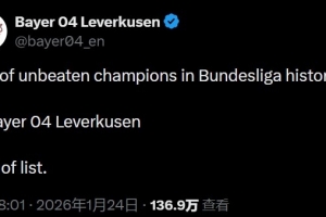 體育資訊1月25日訊 在拜仁1-2輸給奧格斯堡后,勒沃庫森官方更新社交媒體。