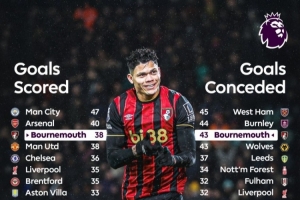 體育資訊1月25日訊 英超第23輪比賽,伯恩茅斯主場3-2擊敗利物浦,據(jù)英超官方統(tǒng)計,伯恩茅斯本賽季英超進(jìn)球、丟球皆排在第三名。