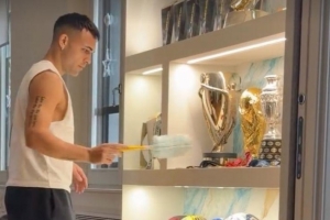 體育資訊1月25日訊 在本輪意甲聯(lián)賽主場大勝比薩后,國際米蘭迎來了短暫的休息時(shí)間,國米隊(duì)長勞塔羅·馬丁內(nèi)斯在家中打掃了自己的獎(jiǎng)杯。