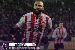 體育資訊1月25日訊 數(shù)據(jù)網(wǎng)站OPTA盤點(diǎn)了本賽季英超球員射門轉(zhuǎn)化率榜單,具體如下(至少20次射門):