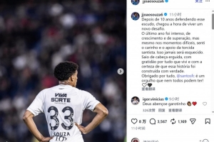 體育資訊1月18日訊 桑托斯19歲左后衛(wèi)索薩即將加盟熱刺,他在社交媒體上發(fā)文,與桑托斯告別。