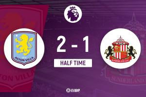 上半場補(bǔ)時2分鐘,阿斯頓維拉2-1桑德蘭。