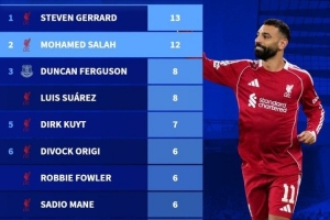 數(shù)據(jù)統(tǒng)計(jì)顯示,薩拉赫在默西賽德郡德比歷史射手榜位列次席。