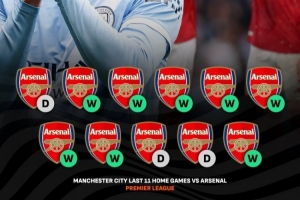 據(jù)livescore數(shù)據(jù)統(tǒng)計,曼城主場對陣阿森納已連續(xù)11場8勝3平保持不敗,槍手始終未能在伊蒂哈德球場取勝。