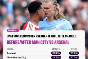 但OPTA超算仍然看好槍手最終奪冠,在本場比賽之前,阿森納奪冠概率高達(dá)85.2、曼城僅14.8%。而在客場失利之后,槍手的奪冠概率依然高達(dá)73%、曼城僅上升至27%。