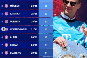 體育資訊4月20日訊 德甲第30輪比賽,拜仁以4-2的比分戰(zhàn)勝斯圖加特鎖定本賽季的德甲冠軍,諾伊爾、基米希、烏爾賴希等人再添一個(gè)德甲冠軍獎(jiǎng)牌。德國(guó)轉(zhuǎn)會(huì)市場(chǎng)盤點(diǎn)了球員德甲獲得德甲冠軍的數(shù)量,諾伊爾和穆勒均拿到13個(gè)德甲冠軍并列榜首,前10均為拜仁球員。