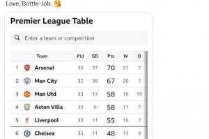 摩根:“所以,阿森納依舊穩(wěn)居榜首,依然將贏得聯(lián)賽冠軍。曼城還是第二,曼聯(lián)依然無關(guān)緊要;利物浦還是實力只剩去年一半;切爾西依舊一無是處;熱刺依然遲早降級。