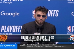 體育資訊4月20日訊 在今天結(jié)束的一場(chǎng)季后賽中,雷霆以119-84戰(zhàn)勝太陽(yáng)。賽后,雷霆球員切特·霍姆格倫出席了新聞發(fā)布會(huì)。以下是完整版采訪內(nèi)容。