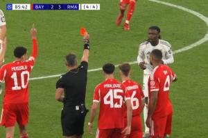 歐冠1/4決賽次回合,拜仁vs皇馬,第86分鐘,替補(bǔ)登場(chǎng)的卡馬文加兩黃變一紅被罰下??R文加被罰下后拜仁連入兩球,總比分6-4淘汰皇馬。