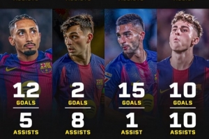 體育資訊1月26日訊 西甲第21輪比賽,巴薩主場3-0完勝皇家奧維耶多。據(jù)媒體統(tǒng)計,巴薩隊內(nèi)8名球員本賽季參與進(jìn)球10+。