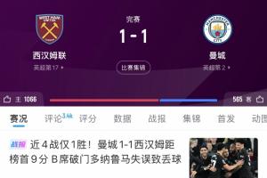 3月15日,曼城客場(chǎng)1-1戰(zhàn)平西漢姆聯(lián),同輪阿森納2-0擊敗埃弗頓。曼城在少賽一場(chǎng)的情況下落后阿森納多達(dá)9分。