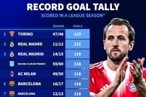五大聯(lián)賽單賽季進(jìn)球榜: