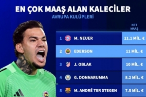 體育資訊4月20日訊 德轉(zhuǎn)列本賽季歐洲俱樂部門將凈年薪排行,諾伊爾1110萬歐居首,埃德松第二,奧布拉克第三。