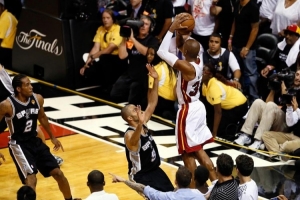 最后19.4秒熱火落后3分,詹姆斯三分不中,波什搶下關鍵前場籃板,隨后將球交給阿倫,后者在接球時順勢撤出三分線,隨后拔起三分,整個動作一氣呵成,球也空心命中籃筐。在隨后的加時里,熱火氣勢如虹拿下比賽,并在搶七中戰(zhàn)勝馬刺,實現衛(wèi)冕。