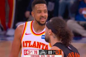 比賽第三節(jié),老鷹球員CJ·麥科勒姆與尼克斯球員阿爾瓦拉多發(fā)生口角,雙方吃到技犯。尼克斯主場球迷開始高呼:“F**k CJ?!?/p>
