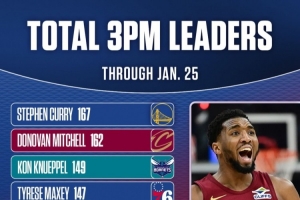 體育資訊1月27日訊 NBC曬出了賽季至今的球員三分命中數(shù)排行榜。其中庫里排名第一、米切爾第二、克尼佩爾第三。