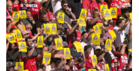 體育資訊04月25日訊 英超第34輪,利物浦vs水晶宮,比賽第13分鐘,利物浦主場球迷集體舉起黃牌,抗議芬威未來三個賽季提高票價的決定。