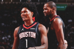 賽后火箭官方曬出贏球海報(bào),阿門(mén)·湯普森和杜蘭特登上封面。